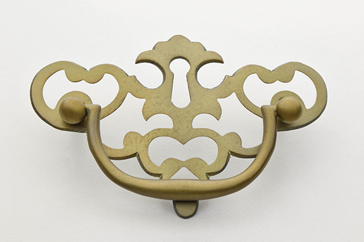 Chippendale brasses are highly decorative brass plates, often called bat wing brasses, with delicate bails and posts. It is important to realize that in this time period, the metal itself was extremely expensive – a far greater production cost than labor. Larger pulls were typically formal and most commonly found on expensive pieces of furniture. Brasses were always hand-polished, as they better reflected light that way. In the days before electricity, evening lighting was at a premium, so brasses of all types served both form and function.