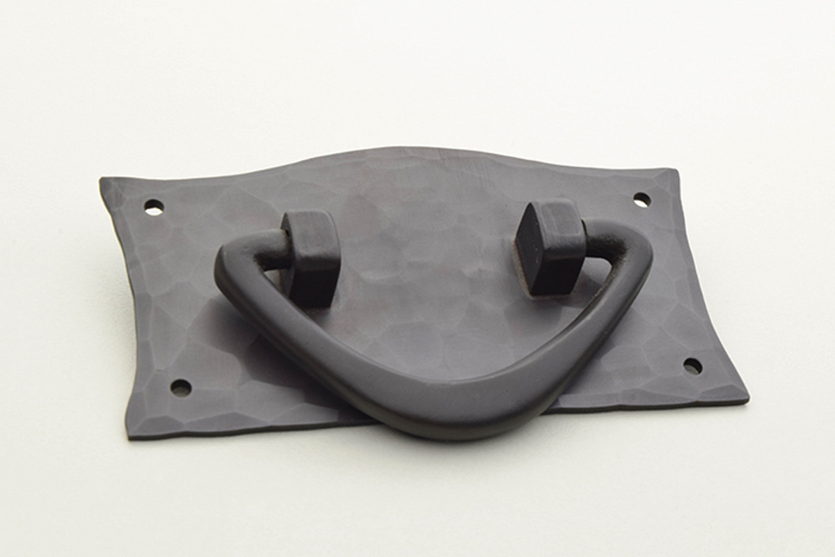 Authentic Craftsman style. Heavy metal with hammered surfaces made from solid copper and with a patinated finish. (Craftsman Hardware Company, Marceline, Mo.)