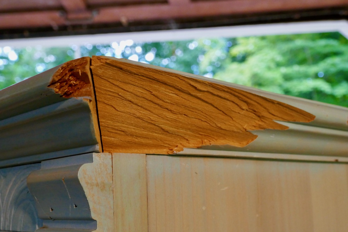 At first, I considered finding the same molding strip, sawing off or removing the broken section entirely, installing a brand-new molding, sanding, and painting the repair. However, after thinking about it for a bit, I decided to take this opportunity to demonstrate how a proper restoration/conservation would have taken place on a much more valuable piece so that a reader who may have a mahogany, walnut, or any other heirloom piece would know how to approach it correctly.
