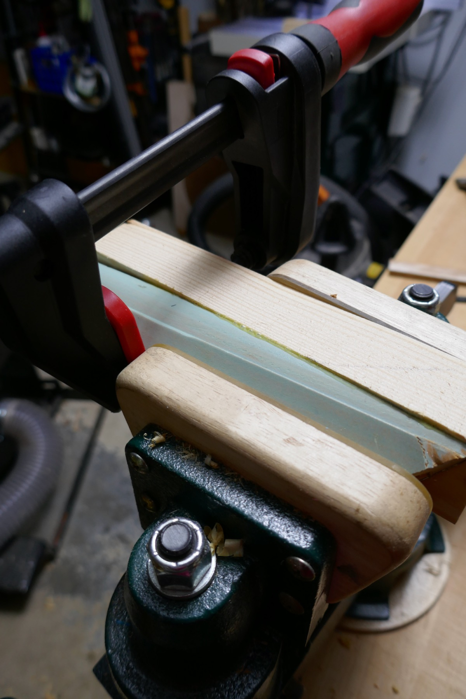 Then, I used a plane to flatten the diagonal break-off area. After that, I looked for a straight-grained piece of pine and glued it over the smooth-planed surface on the original molding. I used my guitar maker’s vice with its adjustable jaws to apply uniform pressure on the parts while the glue dried.