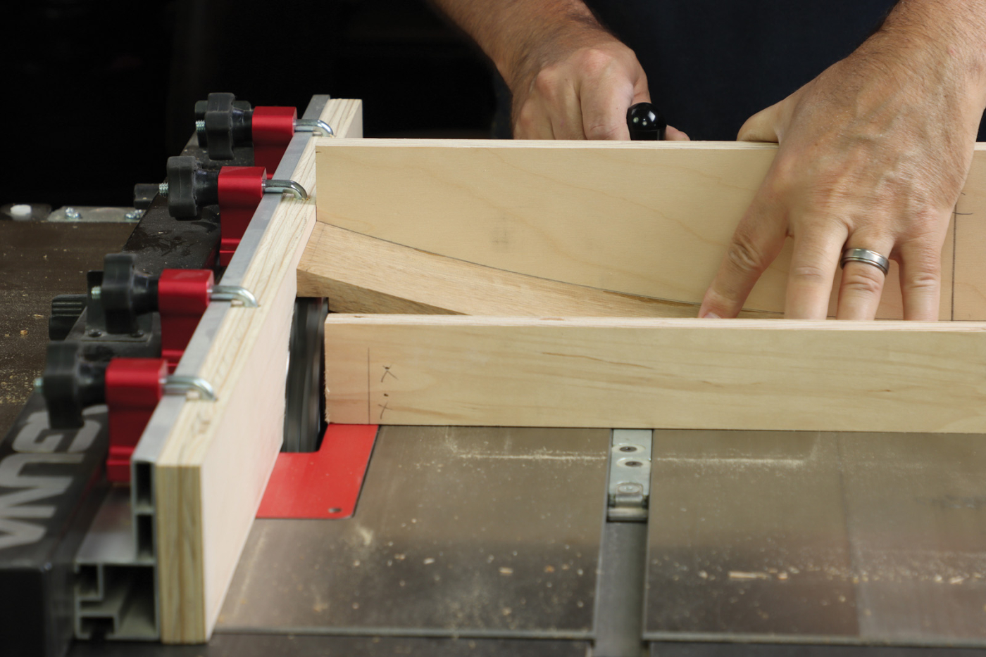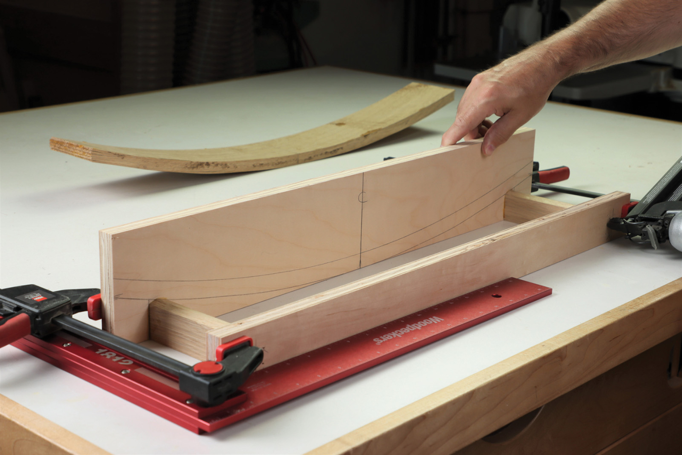 The whole key to accommodating convex and concave parts is a double-bevel cut on hardwood strips that connect the two fences. Using a scrap that’s above 10-12“ long by about 2“ wide, tip your table saw blade to 15°, and bevel one edge. Then, flip the board over and cut another bevel so they form a peak at the center. Draw location marks 11/2“ in from either end of the plywood fences. With the concave face upwards, the curved part should rest on the table saw and be fully supported by the beveled blocks. Position the curved rail in the jig and trace the curved shape onto the rear fence for reference. This will indicate the required height of the beveled strips, which in this case is 11/2“. Rip the beveled board to this width before cutting two pieces 43/4“ long for the jig. Glue and brad nail the strips between the front and rear fence, making sure the assembly is square as it goes together.