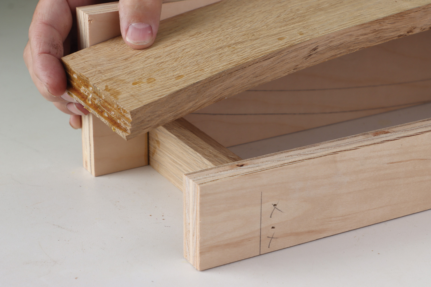 1 Construct the simple jig, consisting of a taller rear fence and shorter front fence, connected by beveled strips of hardwood.