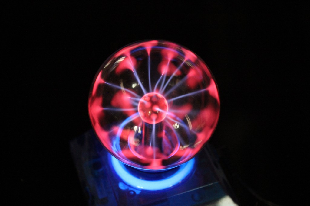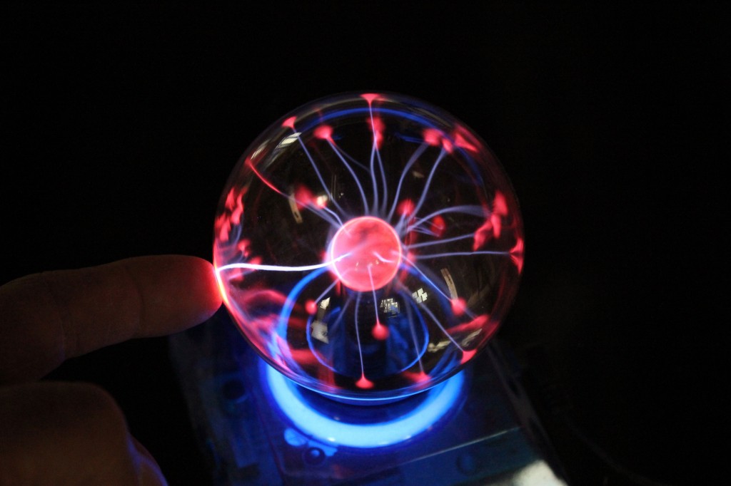 A special power inverter transmits energy into a mix of noble gases inside the plasma globe, and tendrils of energy form between the electrode and the inside surface of the globe. The energy is seeking to escape and reestablish equilibrium of charge. Notice in the photo above how the tendrils are separated. This is because like charges repel. Each tendril is competing for space on the inside surface of the globe and the tendrils move because the gas surrounding each tendril is heated and therefore rises, carrying the tendril with it.