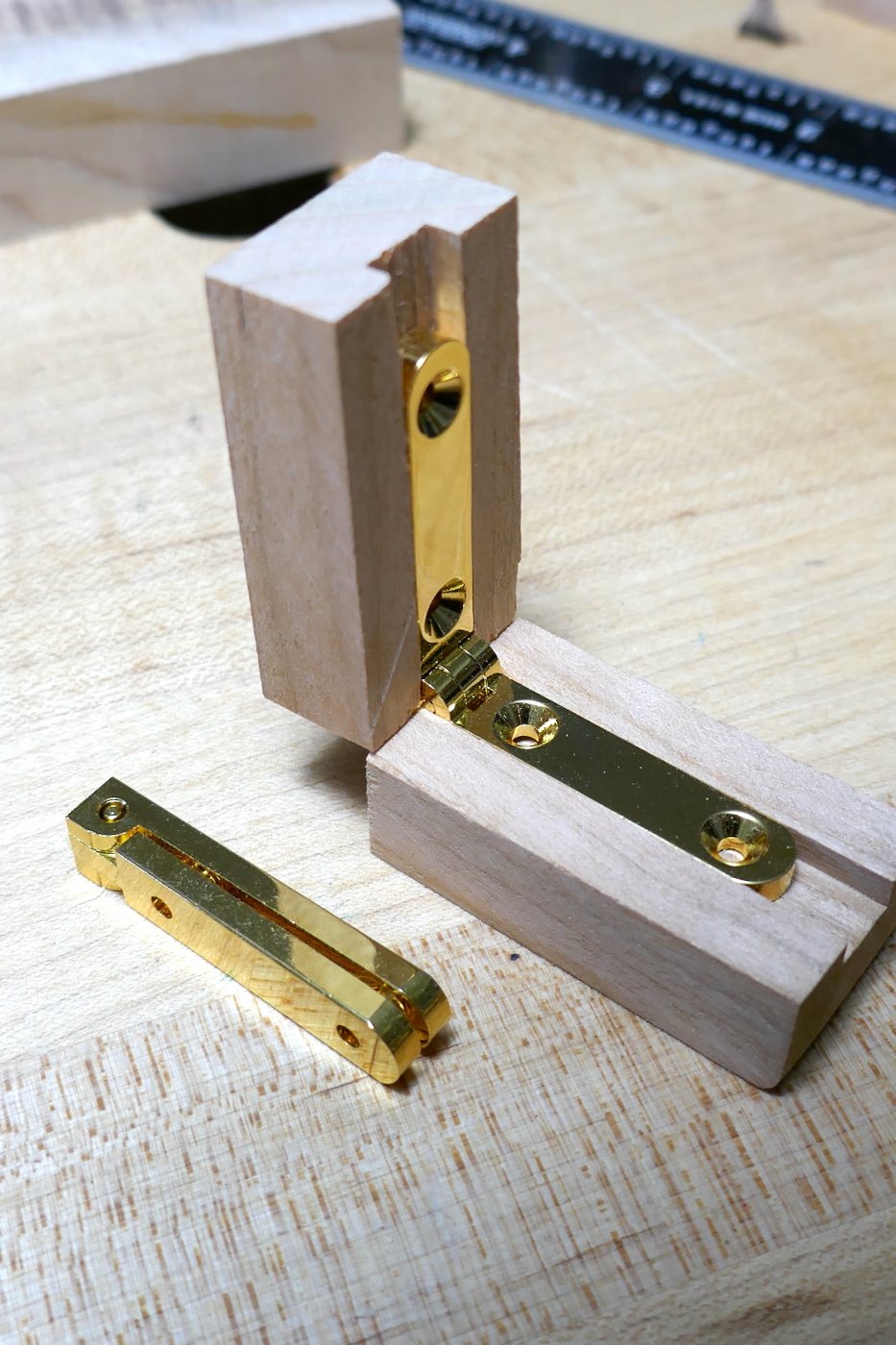 To test the hinge and decide on the best installation location, I created a mockup. I grooved a piece of wood on the table saw and cut it to produce two short parts which nest the hinge’s leaves.