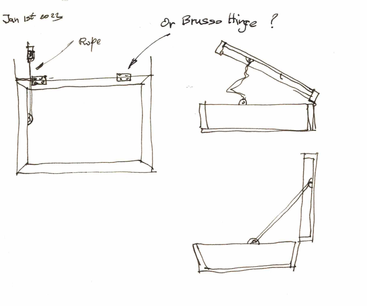 Some early ideas for hinging and preventing over-pivoting of the box’s lid.