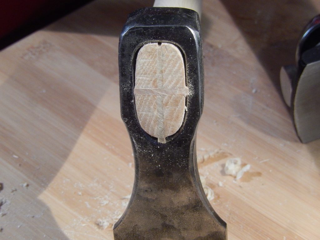 After the glue dried, I cut it flush with the top of the handle. Then I picked up a piece of scrap hard maple and cut a small wedge from it. I placed a chisel over the top of the handle’s neck and strike it to make a shallow indentation in the wood. This little V shape serration was enough to allow the wedge to nest in. With a few decisive strokes of a mallet I was able to drive the second wooden wedge in. Honestly, I was quite surprised how easy it was.