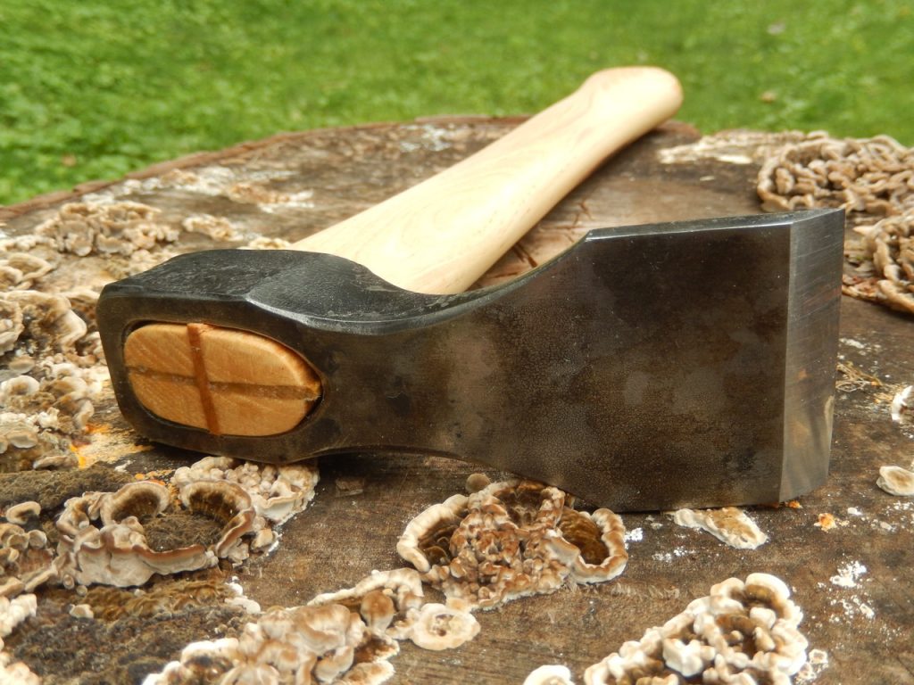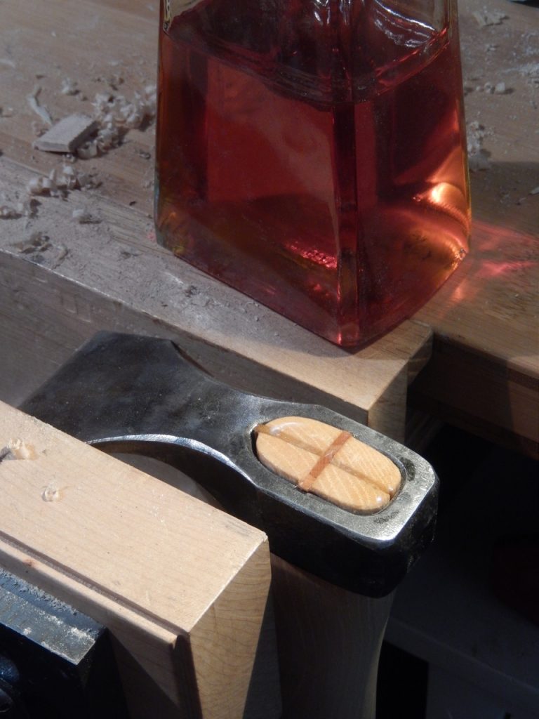 First I saw a wide kerf along the long axis of the handle. After this, I saw a longer than needed wedge on the bandsaw and cleaned it out using a hand plane. After applying some wood glue on the wedge I drove it down the kerf until it felt like the two cheeks of the neck can’t push against the steelhead anymore. If you feel (and hear) that the wedge reached the bottom of the kerf without applying sufficient expansion to the handle, you should extract it out and shorten it (This is the reason why your wedge should be made longer).