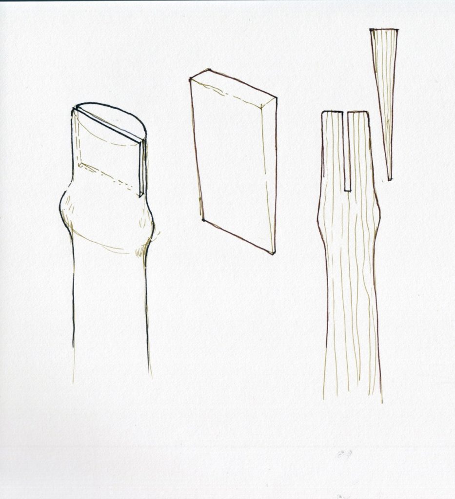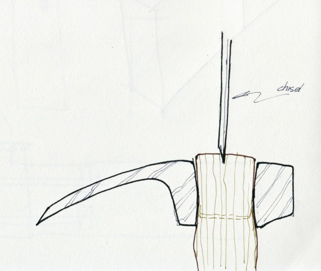 Eric Dennis not only forges beautiful tools, he also forgeS the steel wedges thathelps in hanging them. Eric told me that he followed an old French pattern for a wedge that would split and anchor itself as you hammer it down. This wedge’s tapered part is cut along the middle and then each bank of the split wedge is beveled with a file in opposite directions. As the wedge is being driven down, the two halves are forced to splay. So when the tool is later being put into use, the repeating pounding forces have no chance of dislocating the wedge.