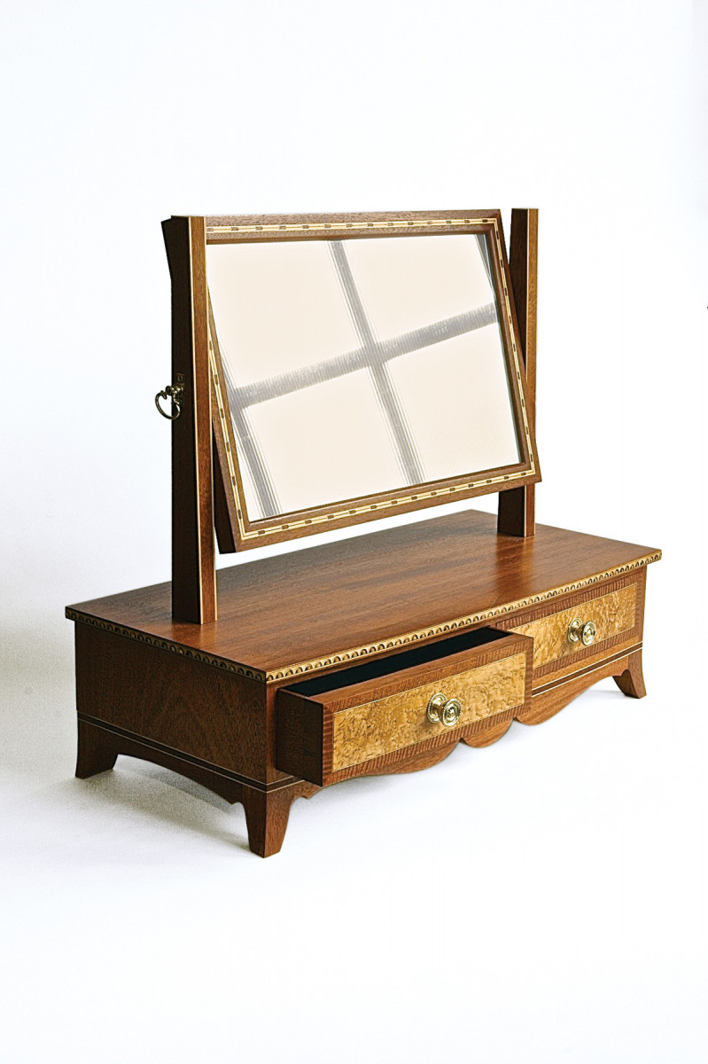 Dressing mirror. This piece features three banding designs: a simple three-piece banding that separates the case from the base; a lunette banding around the case top and an arrow banding around the mirror.