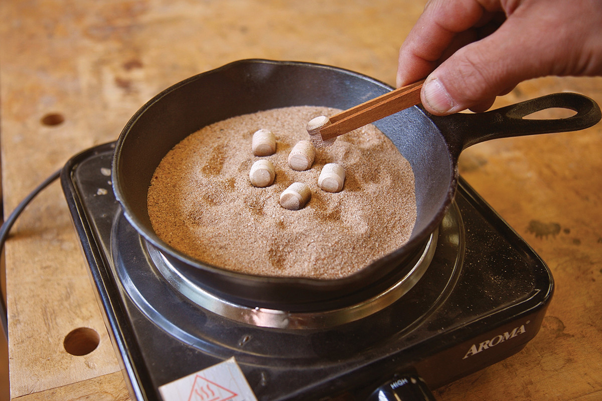 After cutting the plugs, sand shade them on one half. For the best results, I recommend using a small hot plate, a cast iron skillet and a cup of fine-grained sand. Turn the thermostat to high and allow the sand to heat up (it should feel hot to your hand about 6″ above the surface), then select your best plugs and set them into the heated sand. I prefer to shade them a little dark to ensure that once inlaid and sanded, the plugs will still show nicely. It might take some trial and error to determine how long to leave your plugs in the sand.