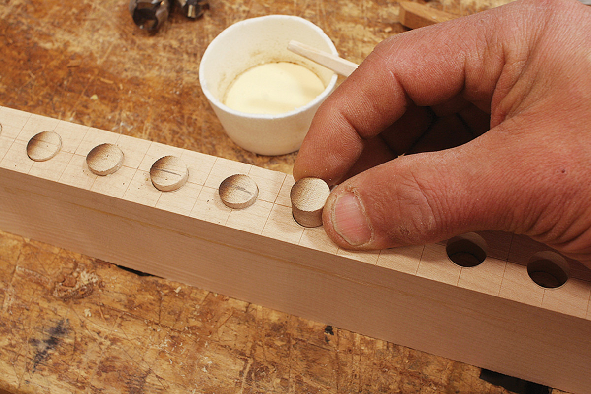 Plugged. Using a good-quality plug cutter and a tight-grained species such as the maple shown here, cut more plugs than you think you’ll need.