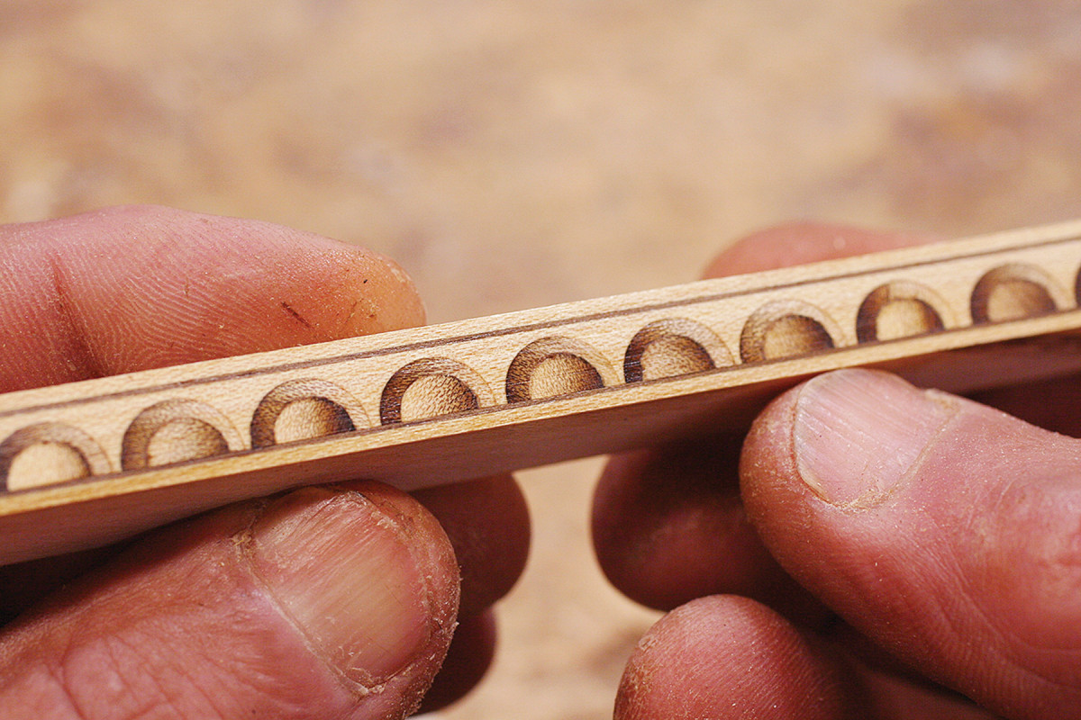 After sand shading the plugs, I arrange them in rows by size (1⁄2” and 3⁄8“), from dark to light, left to right. That way, any differences in shading will be gradual along the length of the banding strip and less noticeable.
