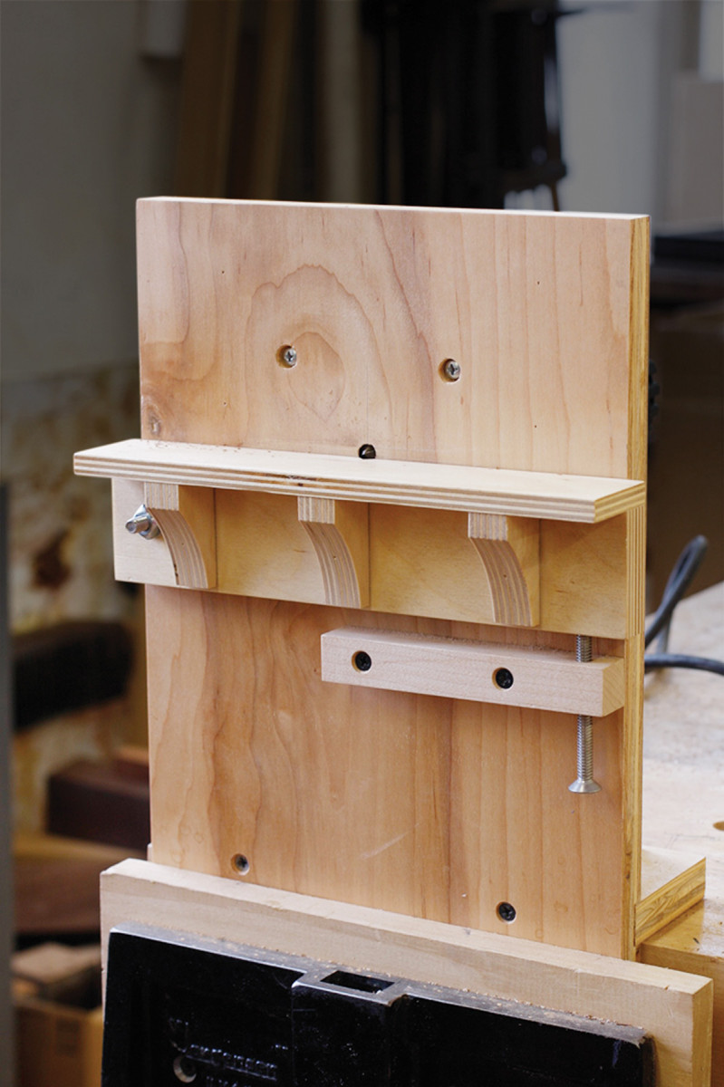 Hold down. The arrowhead pieces are tiny and the router bit is sharp. Protect your fingers – and hold the workpieces tight to the jig’s table – with a hold-down that helps push the workpiece across the bit.