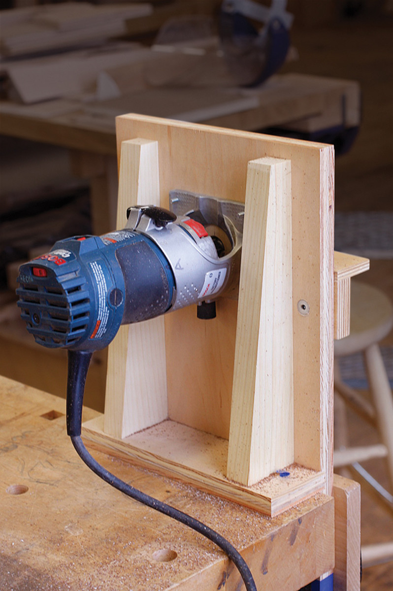 This simple-to-build jig (designed by Frank Vucolo) holds a trim router for making perfect V-cuts for the arrow banding.