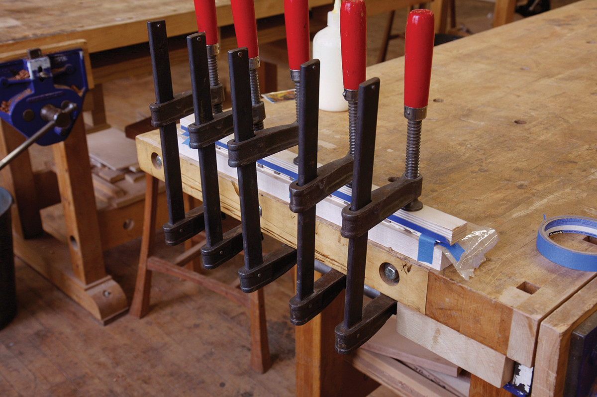 Caul & clamps. With the two outer strips sandwiching the arrowheads and center shafts, place a caul on top and clamp everything to your benchtop until the glue dries.