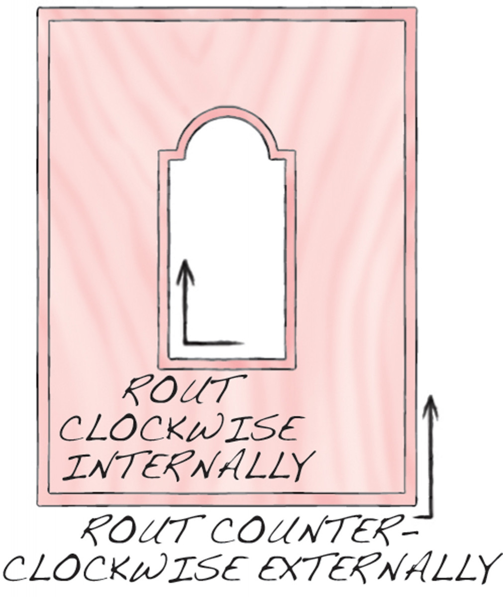 - Never climb cut. (Climb cutting is routing in the same direction as the bit rotates.) Climb cutting can be dangerous because the router bit can grab the workpiece and draw your hands into the bit. Always cut against the rotation of the bit. When routing by hand, the router should be pushed in a counter-clockwise direction for external cuts. When the cut is internal, the router should be pushed in a clockwise direction. When the cut is made at a router table the work should be fed from right to left. An internal cut at the table should be made in a counter-clockwise direction.