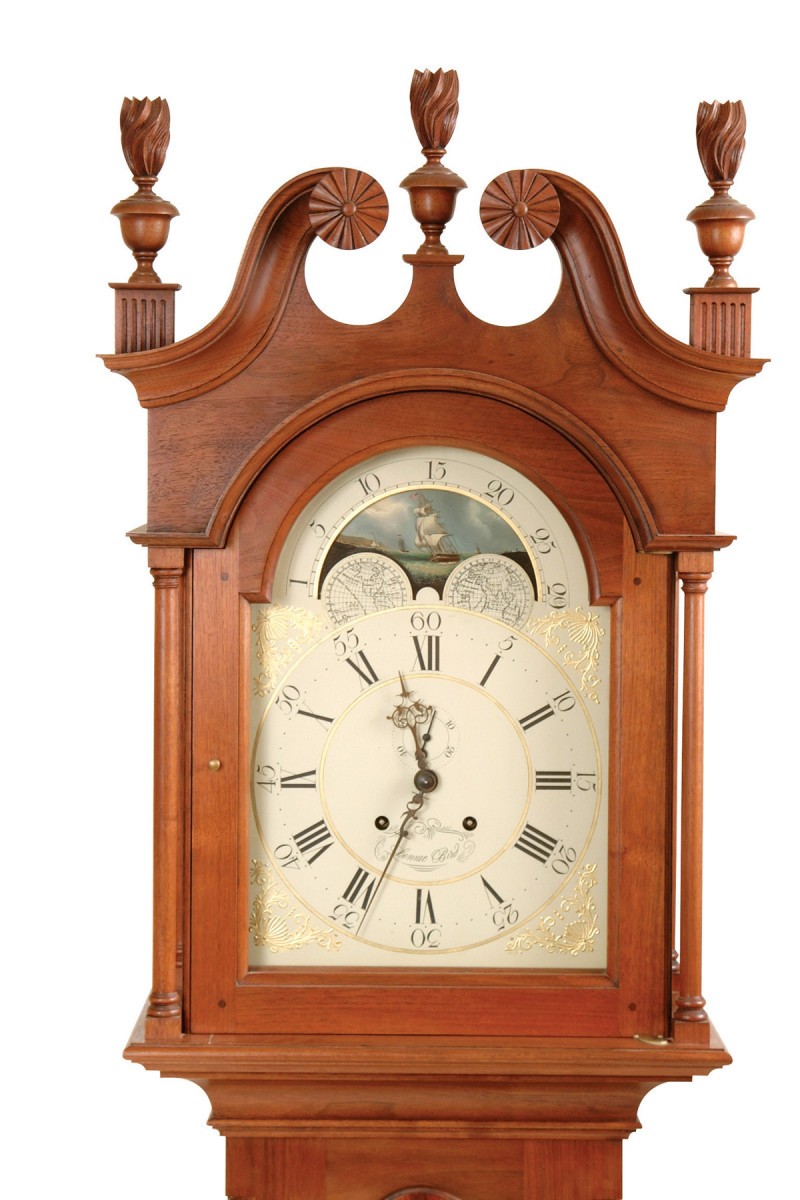 Making the gooseneck molding on this clock required an unusual method of template routing: using an overarm guide (see photo at right). The overarm guide is attached to the top of a router table, and is really just a long arm with a bearing screwed to its end. The bearing rides against the template, and can follow inside or outside curves and straight sections.