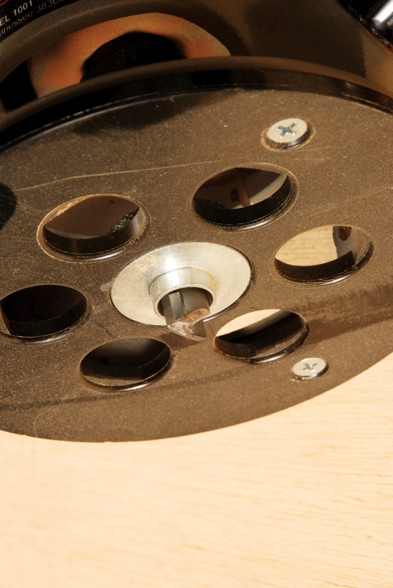 10. A bushing mounted in a router’s sub-base is also a common method of guiding a bit around a template. This method is well suited for cutting grooves of any width.