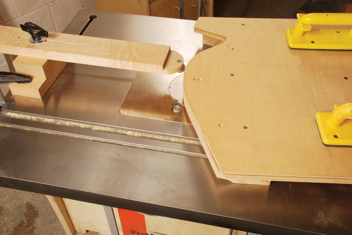 Designing a template for use with an overarm guide is usually pretty straightforward. Make it the same size as the shape you’d like to duplicate, as when using a bearing-guided bit. The offset is created by moving the arm, rather than by adjusting the size of the template.