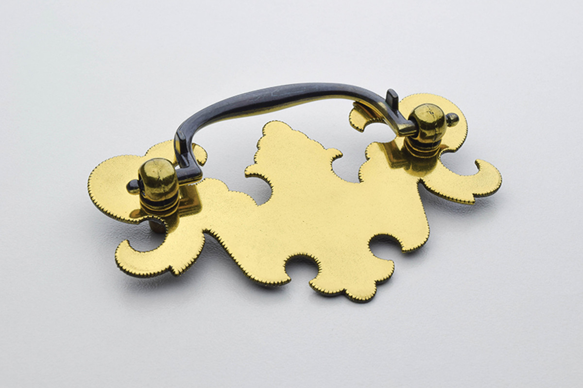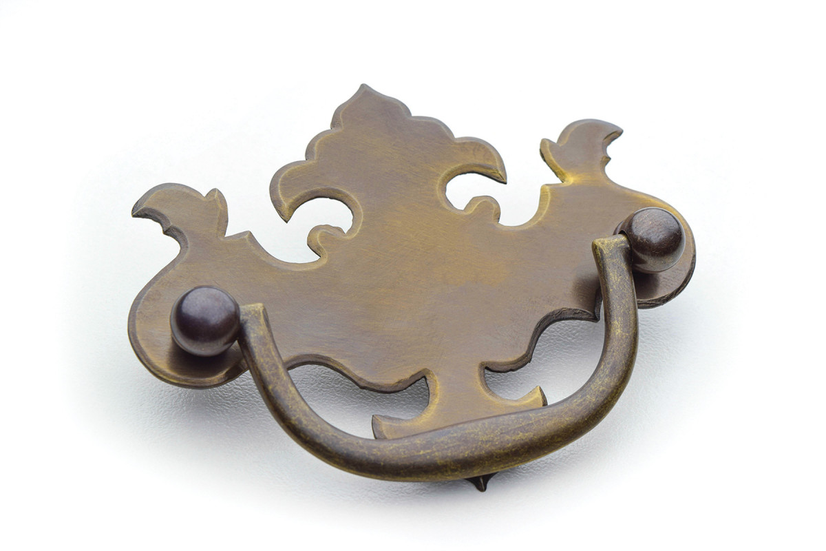 Nice work. Note the bevel on all edges of the plate with some evidence of handwork, the properly closed posts to fit the bails and a rich depth to the antique patina. (I might be a little biased; this is a Horton Brasses Chippendale drawer pull, with the antique finish.)