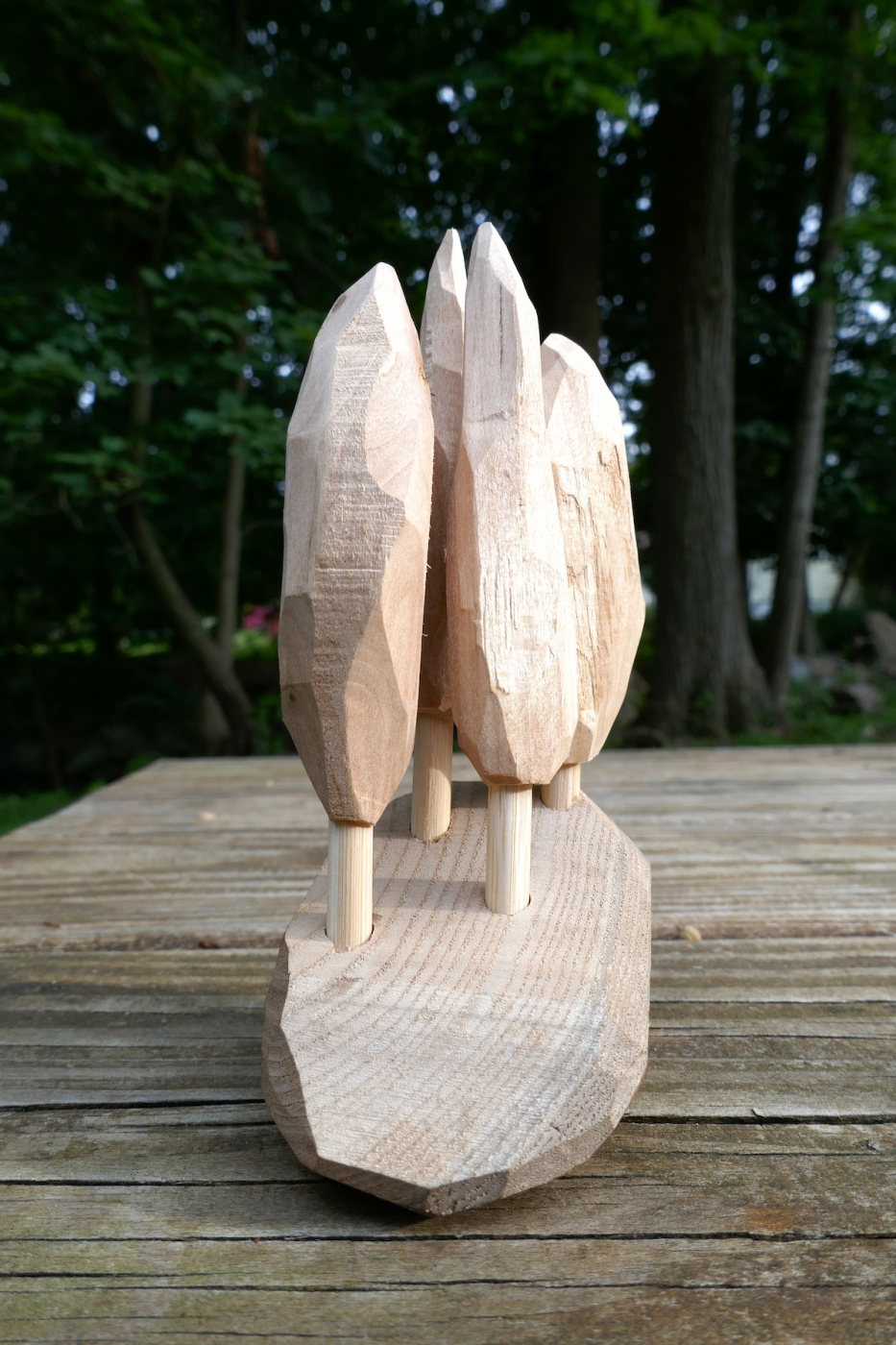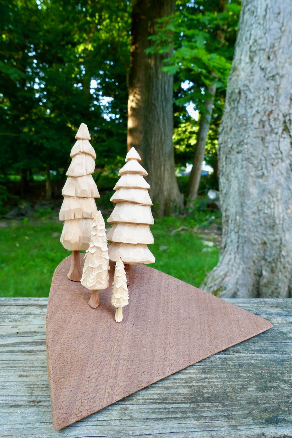 A bluff of basswood conifers planted in a scrap piece of Sapele wood. All you need to craft these trees is a whittling/carving knife.