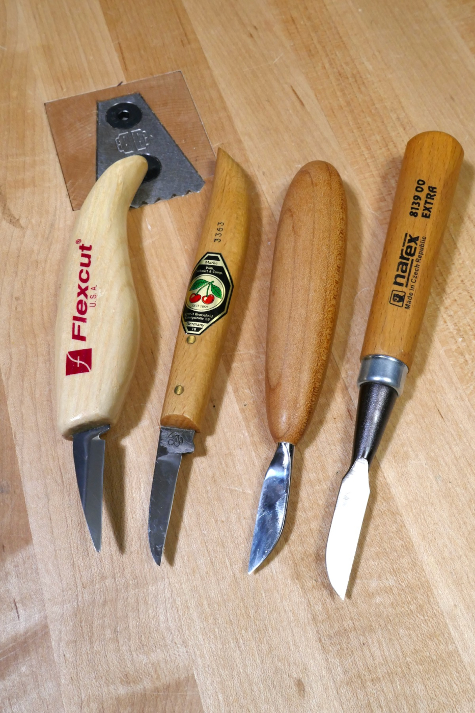 These are my smaller carving knives. From right to left: The American-made Flexcut, the German Two-Cherries, the high Diobsud Forge, and the Narex.