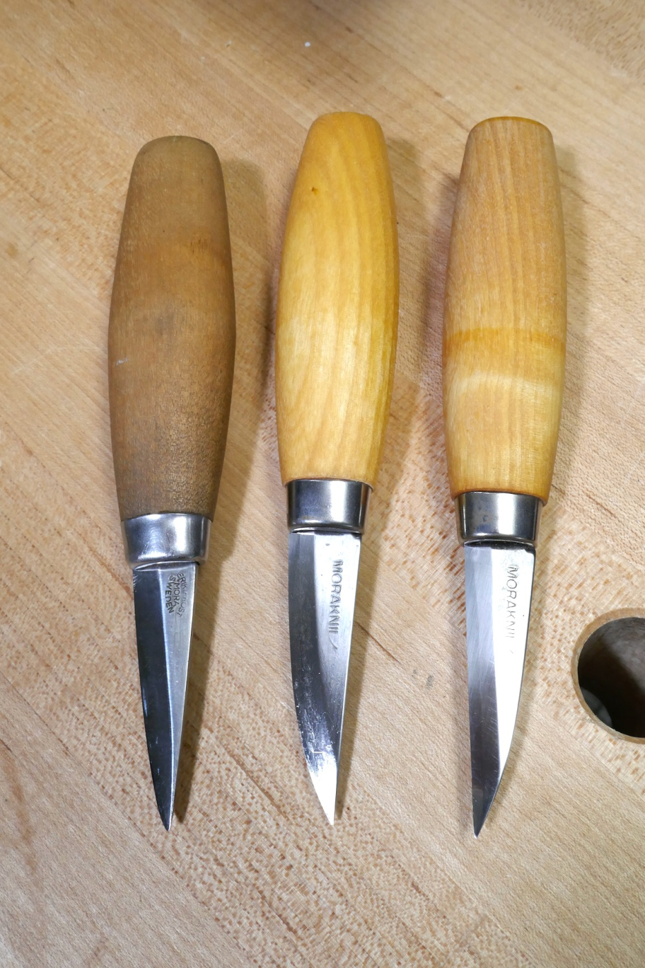 These 2-⅜” Swedish Mora carving knives are my favorites. From right to left: an old #120 embossed with the name Erik Frost, a new #120, and a new straight blade #122.
