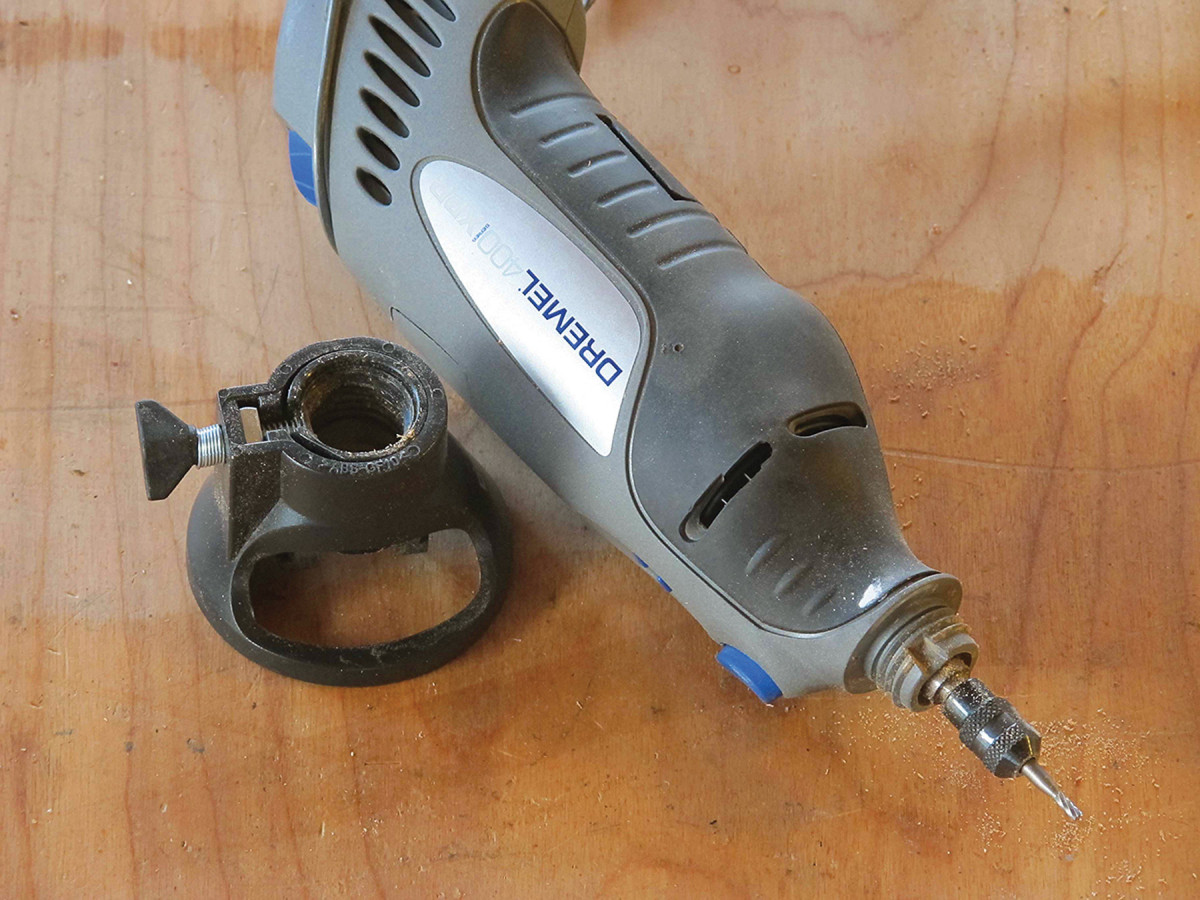 The right tool. It’s important to make sure your rotary tool can accommodate 1) the right size cutter for your project, and 2) a stabilizing collar that can turn the tool into a mini-router, and enable its use as essentially a drawing tool.