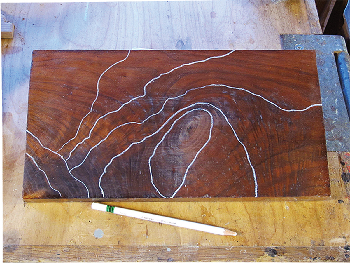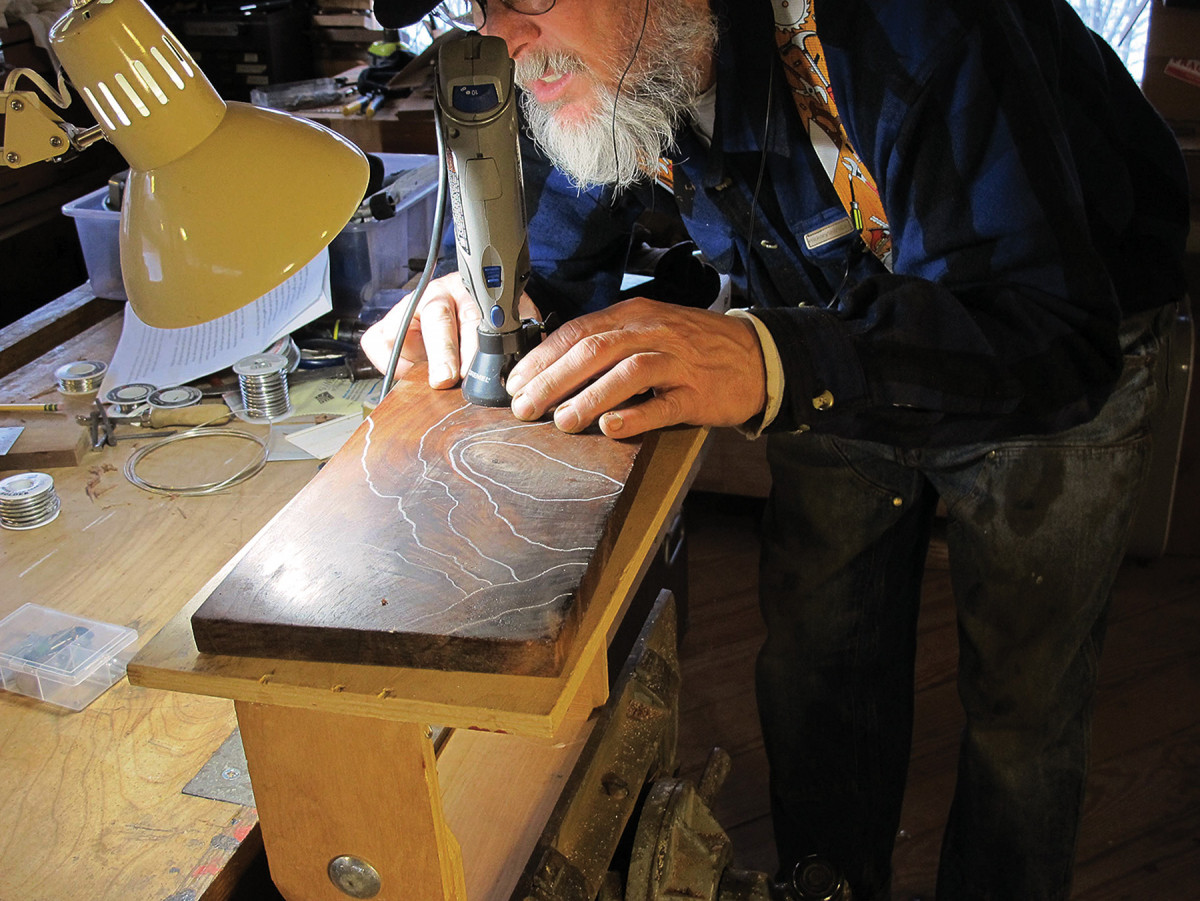 For more free-form designs, such as the one completed for this project, I first mark the impregnated surface with a pencil indicating the design I am trying to accomplish, then set up the tool, lighting and my eye so that I can carefully follow the pattern I have laid out on the surface.