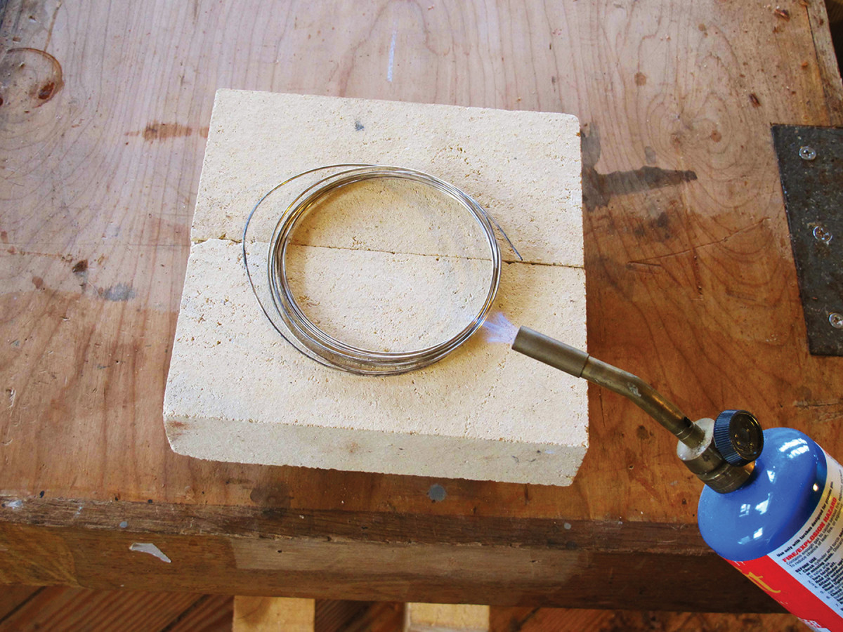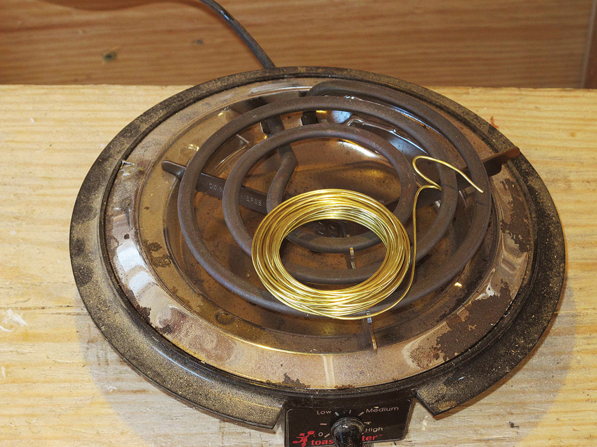 Others, such as brass and silver, need to be first annealed, or relaxed, to reduce their stiffness and make them easier to pound and bend as needed. I anneal metals by either placing them directly on an electric hot plate on “High” and letting them cook until they have changed color thoroughly (which indicates they are done), or by reaching the same color by hitting them with the flame from a propane torch while the spool of wire is sitting on a bed of firebricks.