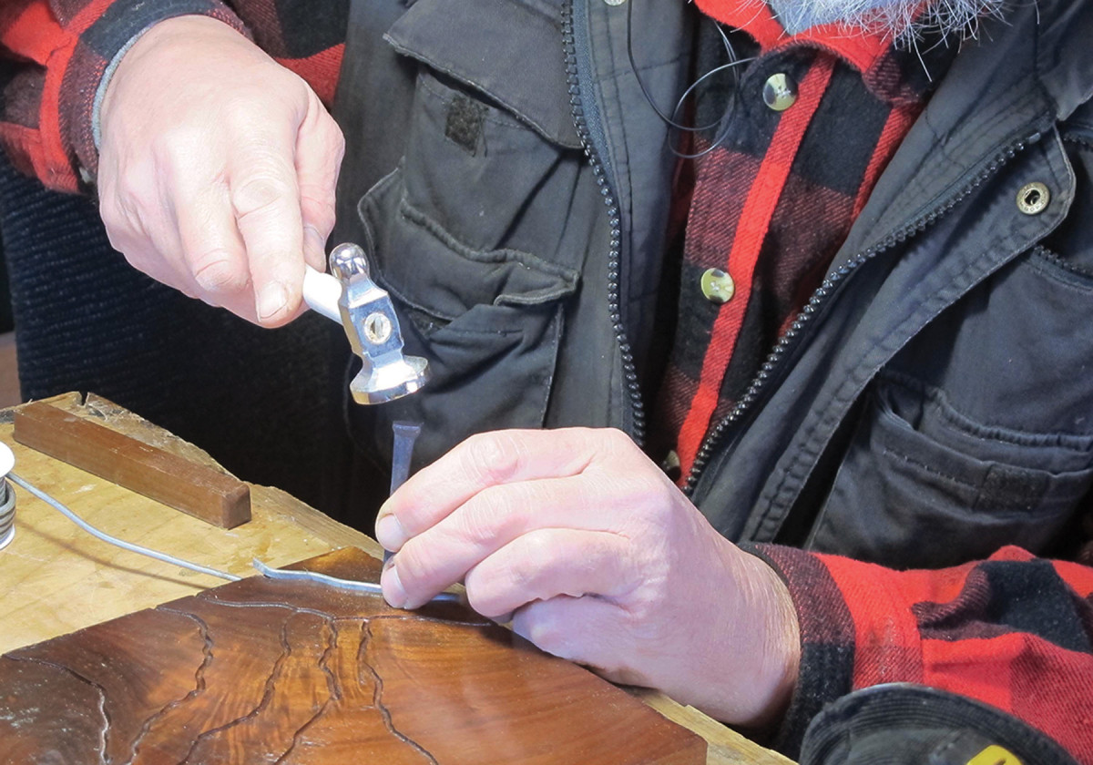 The idea? Inlay wire into the presentation surface to enhance the already eye-catching beauty of the swirling grain pattern. The beauty of the technique is that it can be used for just about any kind of metal wire that fits the project – copper, brass, silver, pewter, aluminum, steel and even gold – and employed for any type of artistic expression, whether linear accents, scrollwork or free-form.