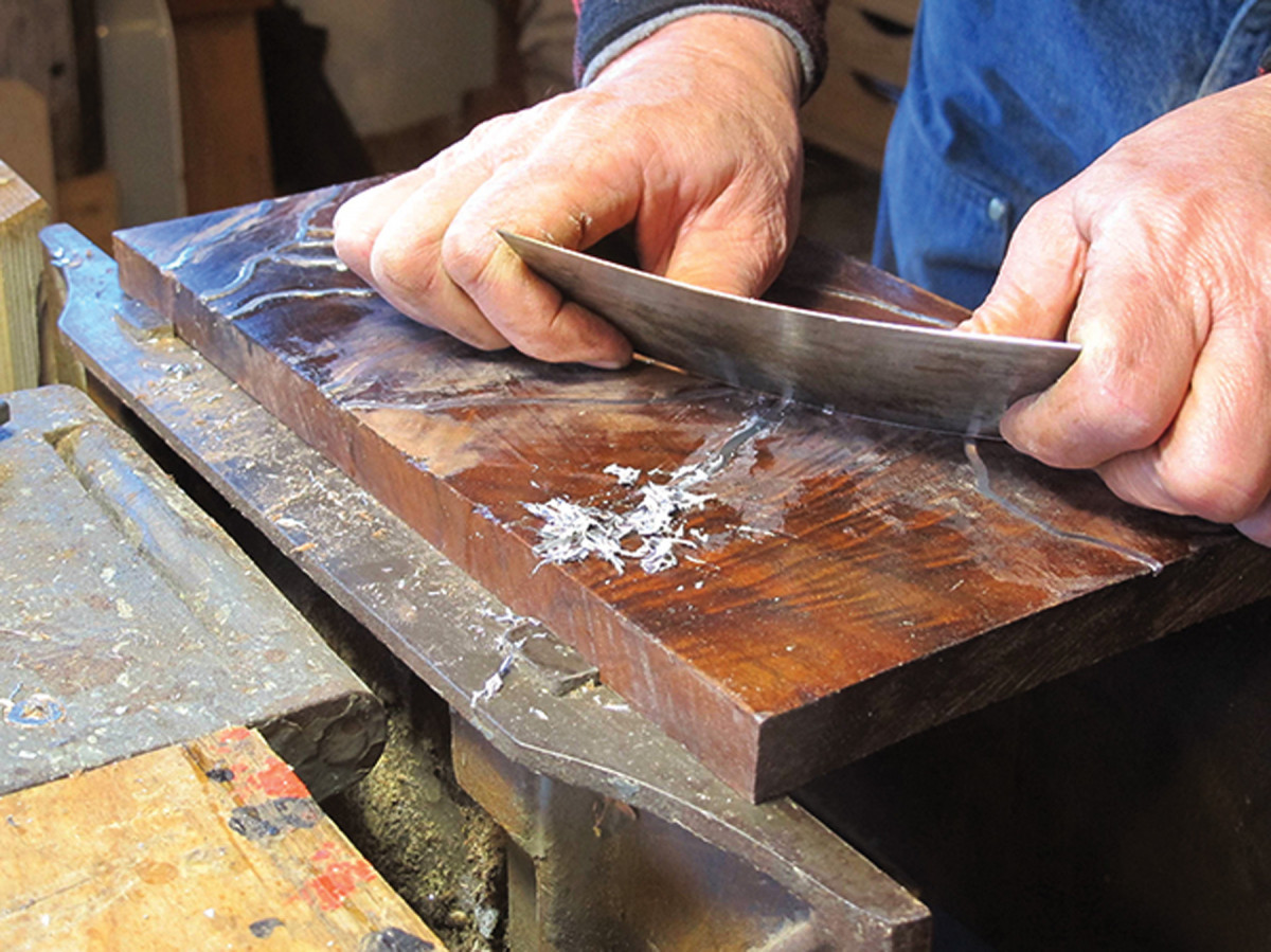 Not a tough scrape. Scraping the wire inlay flat is simple because the wire is much softer than a card scraper. Just make sure to work along the length of the inlay so you don’t snag and risk dislodging it.