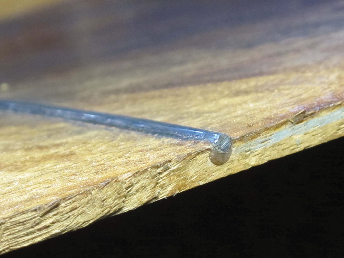 Another option is to leave the wire proud of the surface and burnish it with another homemade “nail tool,” then move on to whatever applications of finish you want so that it is a glistening design element much like that used by Greene & Greene in some of their work.