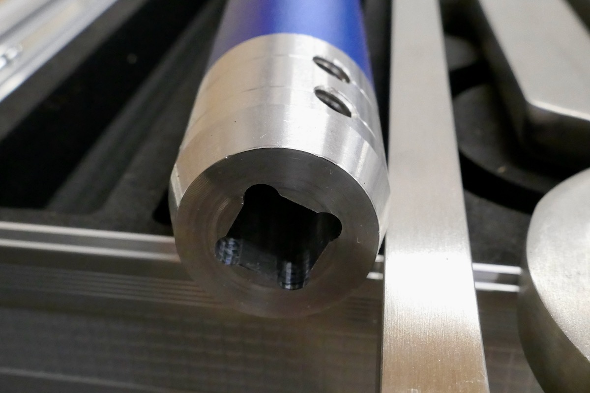 The collet of this aluminum handle securely fastens over the steel shaft using two set screws.