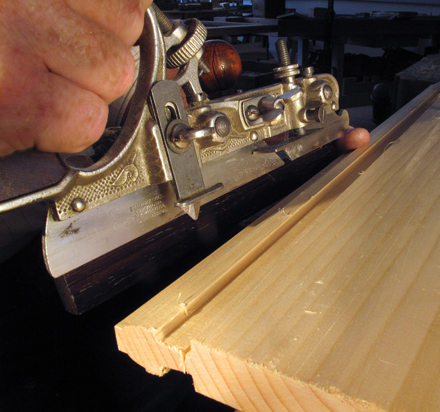 Beads have long been handy to give a shadow line, distract from gaps and make corners tougher by replacing the sharp angles with a rounded surface less prone to splintering and damage. For tongue-and-grooved stock, the “beading gauge” packed with the planes serves as a little auxiliary fence that slips into the socket on the front of the second runner of the plane. Using this fence instead of the normal one ensures that you are fencing against the certain shoulder of the tongue instead of the unreliable tip.