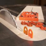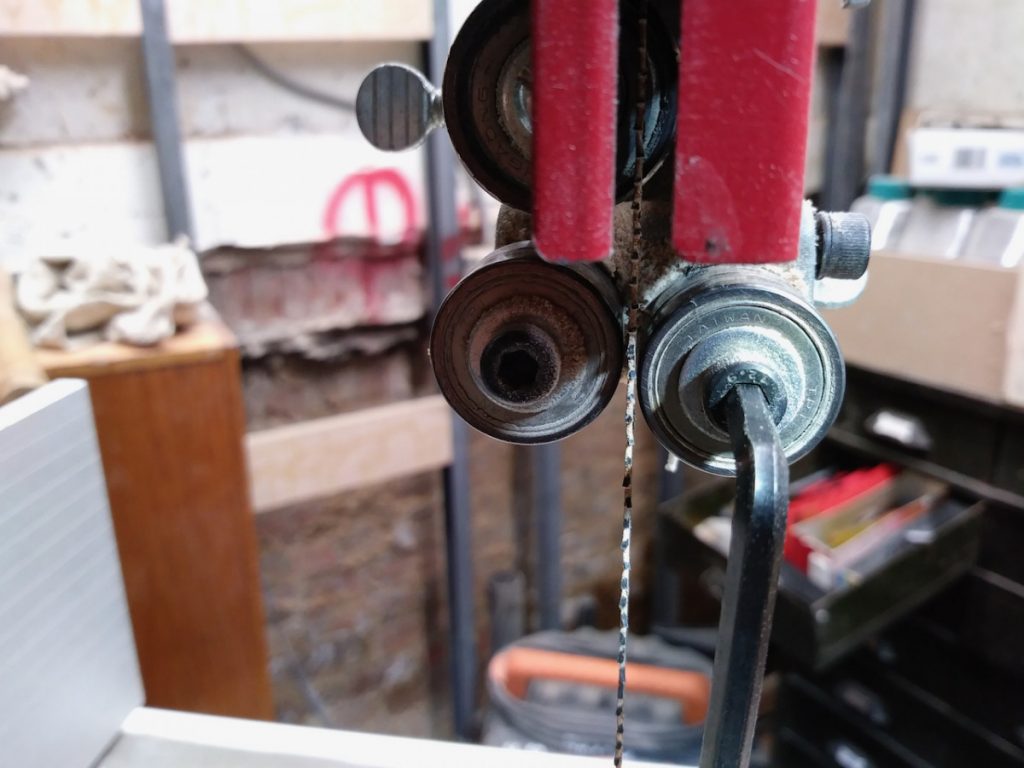 After mounting the band saw blade over the tire you still have one last important adjustment to take care of. This last point is generally not addressed in all the videos that I watched on youtube. I am talking about the necessary re-adjustment of the blade’s bearing or “cool blocks” after replacing the tire. Here is the thing- your new and tougher tire is probably thicker and stiffer than the old rubber one. When mounting the band saw blade over the new tire, you’ll notice that it will be positioned further away from the wheel’s center and as a result, will push against the right bearing or the right block. I discover this by chance after I gave my saw a trial run and notice that something was off. To properly address this issue you will have to pull back all four bearings and re-adjust them to barely touch the blade. After this, re-check the blade for squareness with the saw’s table and adjust if needed.