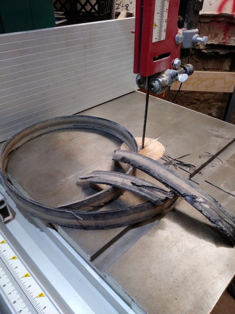 A few weeks ago as I was ripping a board on our Grizzly band saw, I felt a kick and heard a bang, the saw blade slipped out of the track, and pieces of black stuff began snowing down from the upper encasing of the saw’s wheel. I immediately stopped the saw and opened both wheel doors. What I found was shocking: the upper wheel-tire was completely sliced to pieces and falling apart in my hands.