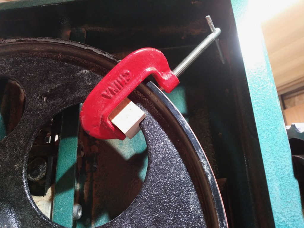 Cutting the excess was easy, and immediately afterward I went to the band saw to mount the tire on the track. There are two main ways to do it. One calls for softening and widening the tire using hot water, then quickly wrapping it around the wheel. The other techniques require clamping one side of the tire onto the wheel and then stretching and carefully slipping it into its track. When I first mounted a new urethane tire over a band saw wheel a few years ago I used the hot water technique. This time, however, I decided to give the clamp & stretch method a chance. I prepared a clamping caul to help me mount a small C-clamp through one of the round openings in the wheel, clamped it over, and began stretching and conforming the tire band over. BTW, if you have one or more vise-grips they might work better for you as you could “walk” these locking pliers over the tire as you go (remember to protect the new tire from the Vise-grip’s teeth). In my case, I only used a clamp and a wooden dowl that I deployed as a prybar to coerce the tire into its track.