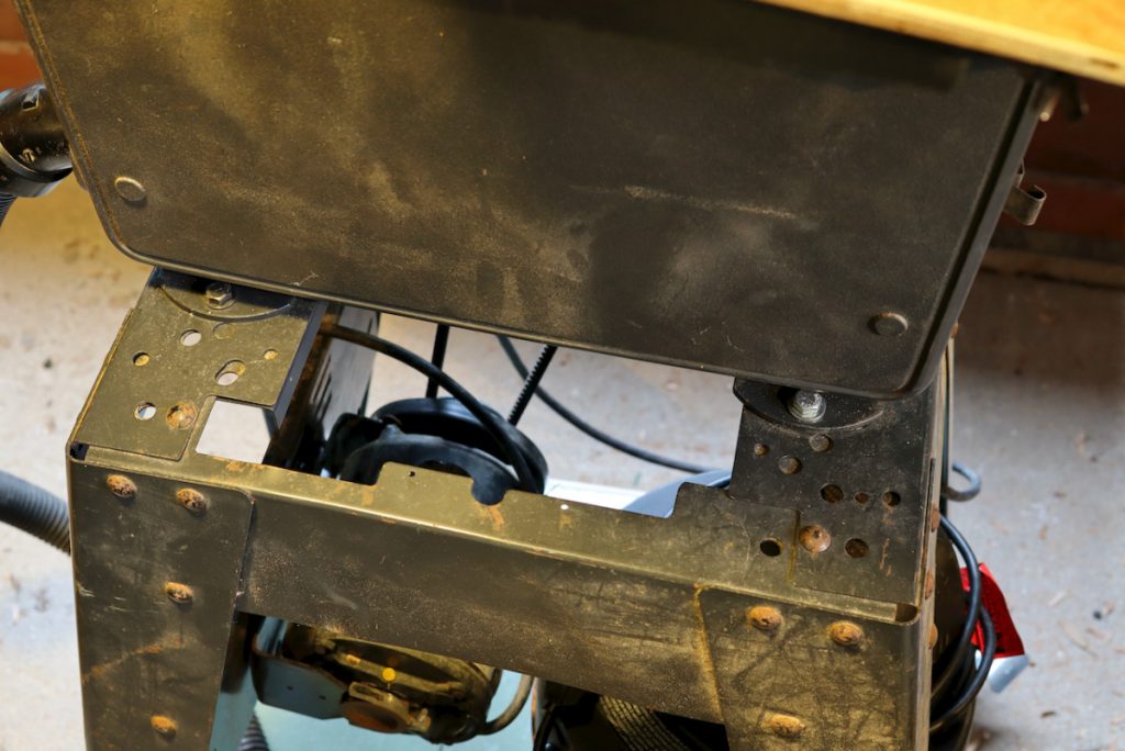 Most of these ready to assemble steel bases have plenty of holes all around that can provide us with ample hanging and affixing opportunities. If your base is hole-deprived just use a twist bit and drill the steel through. This is very easy as the steel is not that thick. Just remember to put a drop of oil on the designated hole area to make the process effortless.