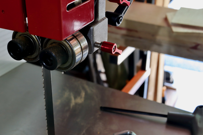 The ones I decided to buy were the red-handled rotating knobs with a single wing (aka, adjustable thumb lever screw and threading rotating knob). These are very convenient thumbscrews that are perfect for locking the blade’s bearing rotation screws (or cool blocks in some bandsaws). The winged screws’ adjustable knob is spring-loaded, which allows it to be pulled out and repositioned into a more friendly angle. This feature is very important as it prevents the screw from becoming an obstacle to material that travels underneath it.