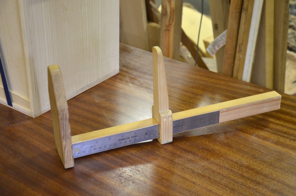 To avoid hurting the delicate statue with a metal caliper Takuji built this makeshift caliper from a 12″ ruler and some scrap wood parts. He used it to transfer the measurements of the Buddha’s base to the spacial wooden tray that will carry it. He then excavates a basin in the tray to house the artifact.