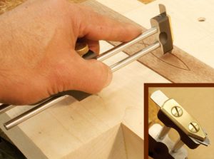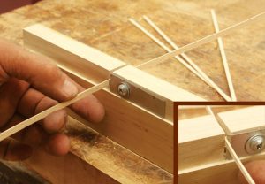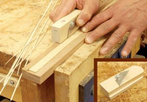 1. This straight line cutter works like a marking gauge 2. A radius cutter works like a trammel to make circular 3. This slitting tool cuts stringing material into narrow 4. This shop-made jig shaves the stringing to exact |