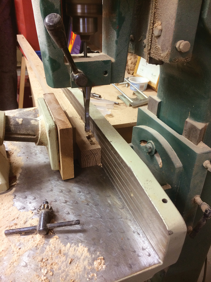 Drill a 38“-diameter hole in the notched part at the back to allow the carcase to expand and contract, then glue and screw the cleat in place on the front leg, taking care to make the top face flush with the top edge of the front rail.