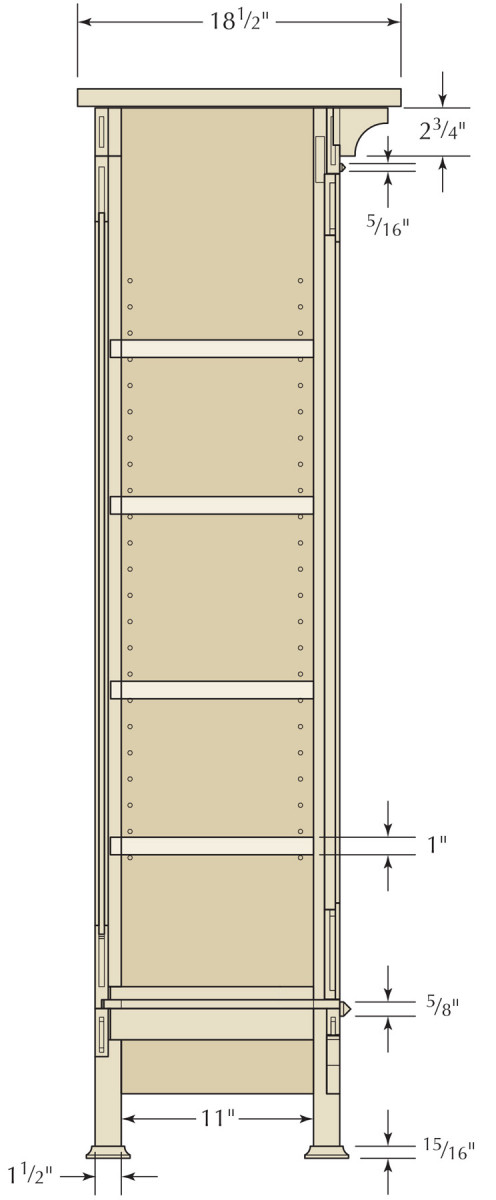 Shelf-pin holes. The holes are 3⁄4″ on center from the inside edges of the legs, spaced 11⁄2″ apart vertically. I use a 1⁄4″ Forstner bit at the drill press to bore them. For the most harmonious appearance in the finished case, align one or more of the shelves with the lead lines in the glass (and with the muntins, in a mullioned door, for that matter).