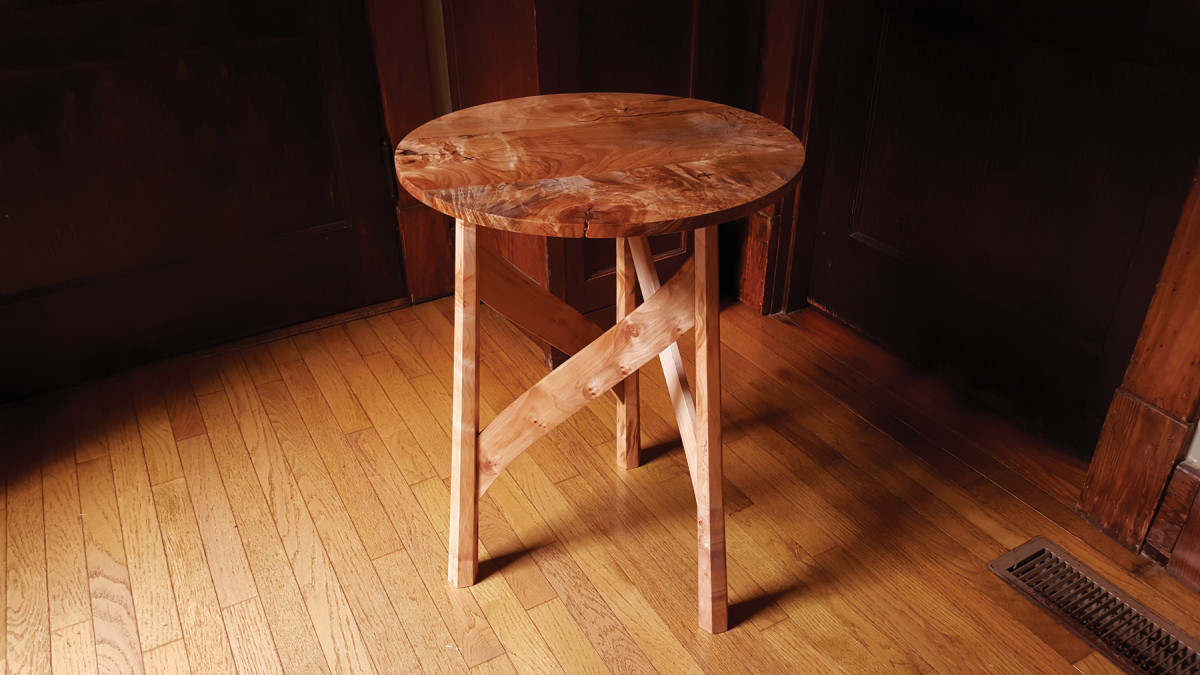 Though it is made from only seven parts, this little table presents several challenges. First, there is not a single right angle in sight. The three legs are splayed and joined with curved stretchers angled upward from left to right, which flow into the round top. As if all that were not challenging enough, the legs are tapered and hexagonal.
