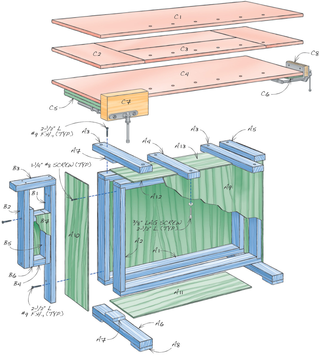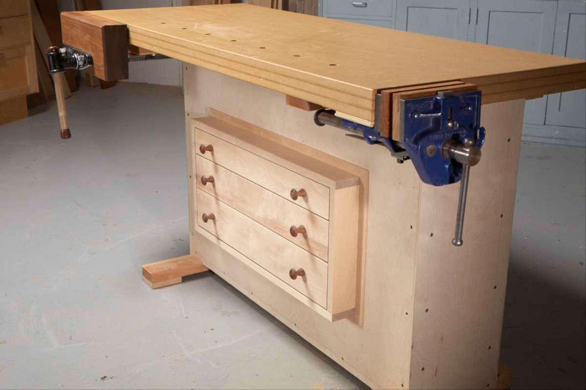 This bench is every bit as good as one that costs thousands of dollars. It’s rigid, heavy and dead flat. Its vises offer all the holding power you need. But you can build it on a budget in a short time.