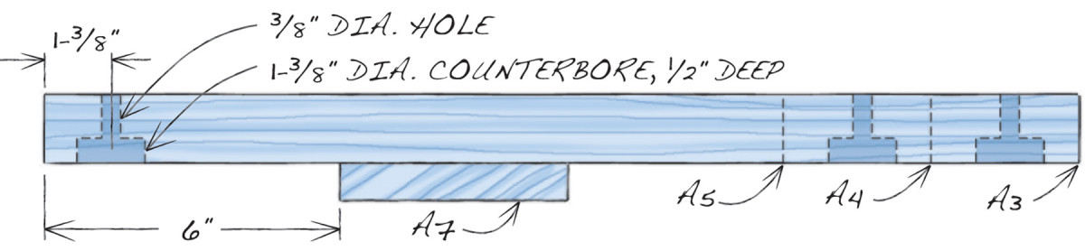Make the cleats (A3, A4 and A5) and feet (A6) by gluing spacers (A7) to each piece (Fig. C). Be sure that the spacers are positioned square to the piece underneath. Trim the spacers flush (Photo 4). Drill holes in the cleats for fastening them to the top with lag screws.