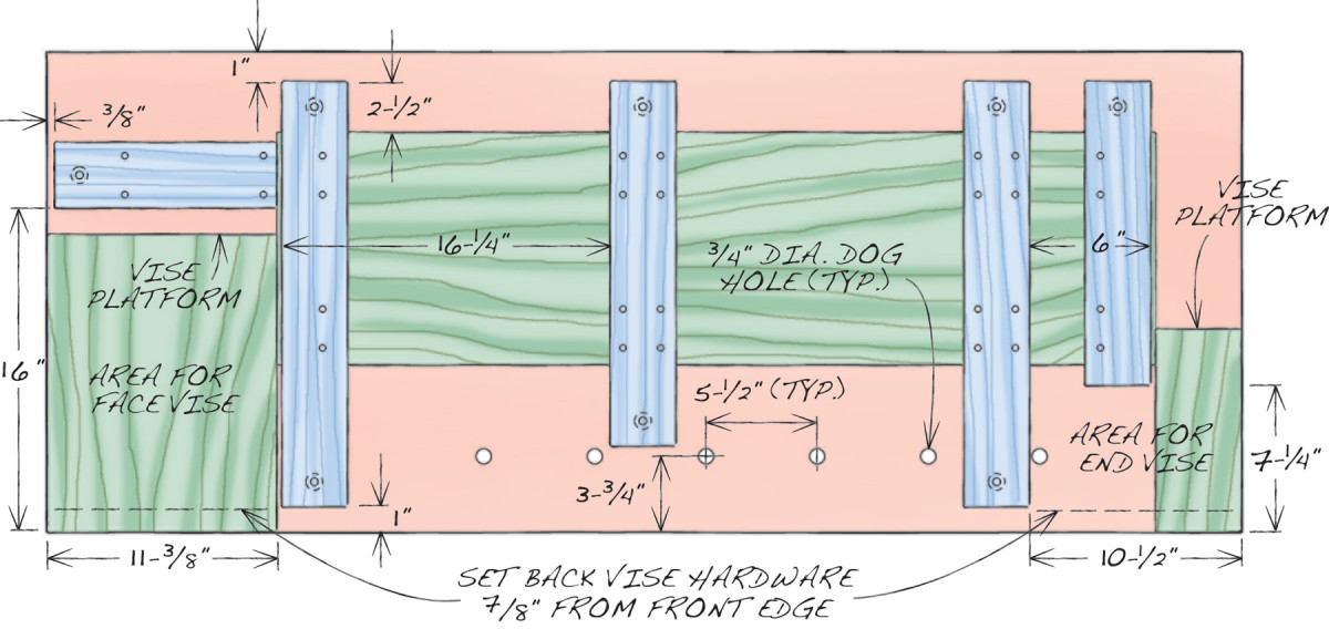 The top of the face vise should be flush with the top of the bench. Drill the mounting holes in the vise face so it sits about 1/16″ above the benchtop, then level the vise’s top after it is installed. Follow the same procedure with the end vise faces (C8).