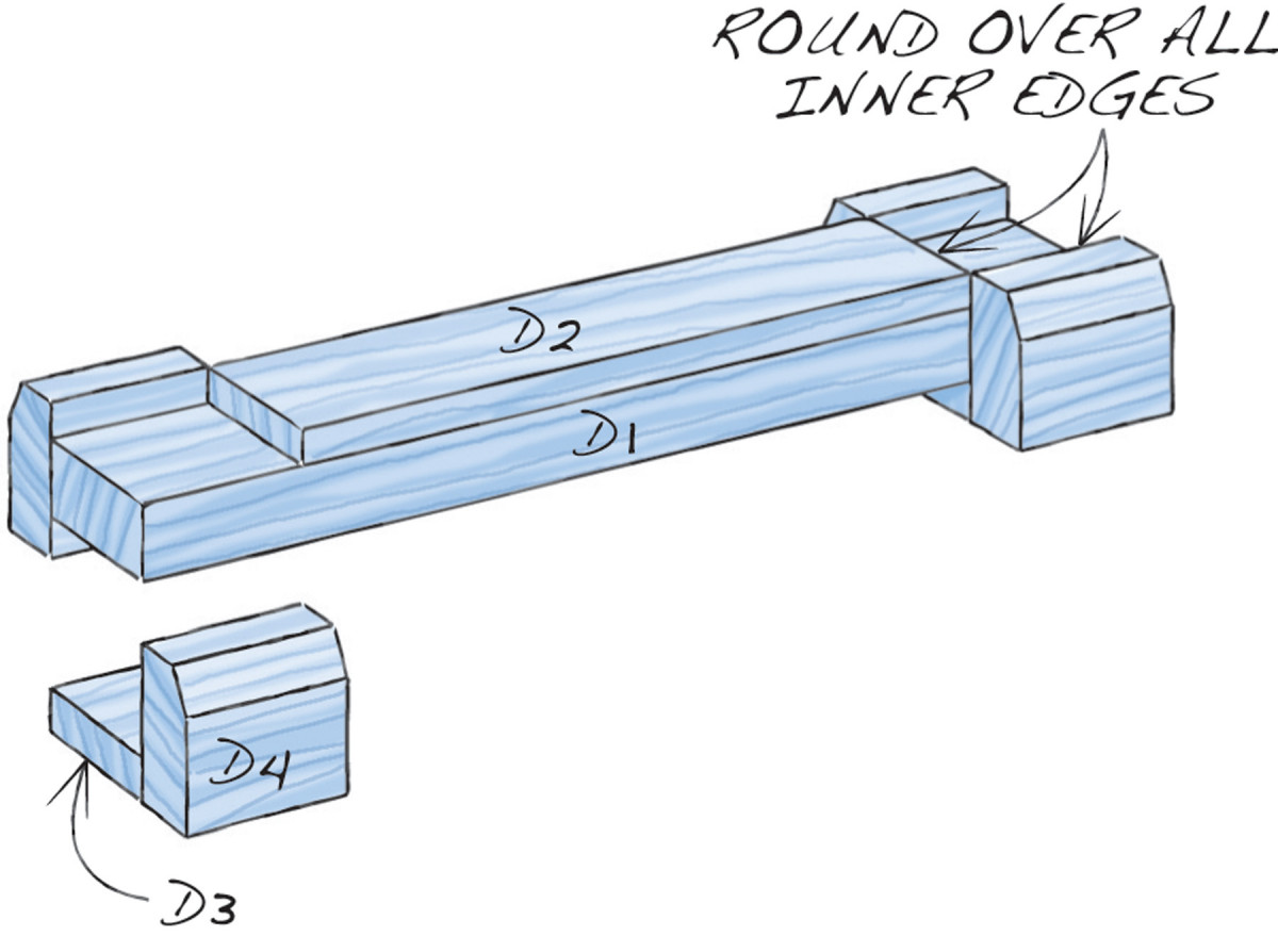 Make the riser blocks (D1–D4, Fig. G). You can make these any height you wish. They should fit tight, so the bench won’t wiggle.