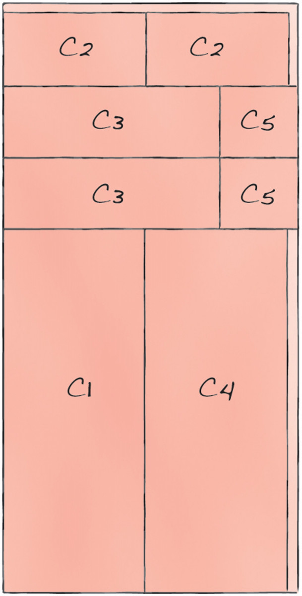 Cut all of the top pieces (C1–C6, Fig. E) to size. You’ll be building the top in stages, upside down. Each layer is glued to the piece below using 1-1/4″ screws as clamps (Photo 7). To begin, place the top (C1) on the assembly table, then place the center pieces (C2 and C3) in position and make sure they fit snug.